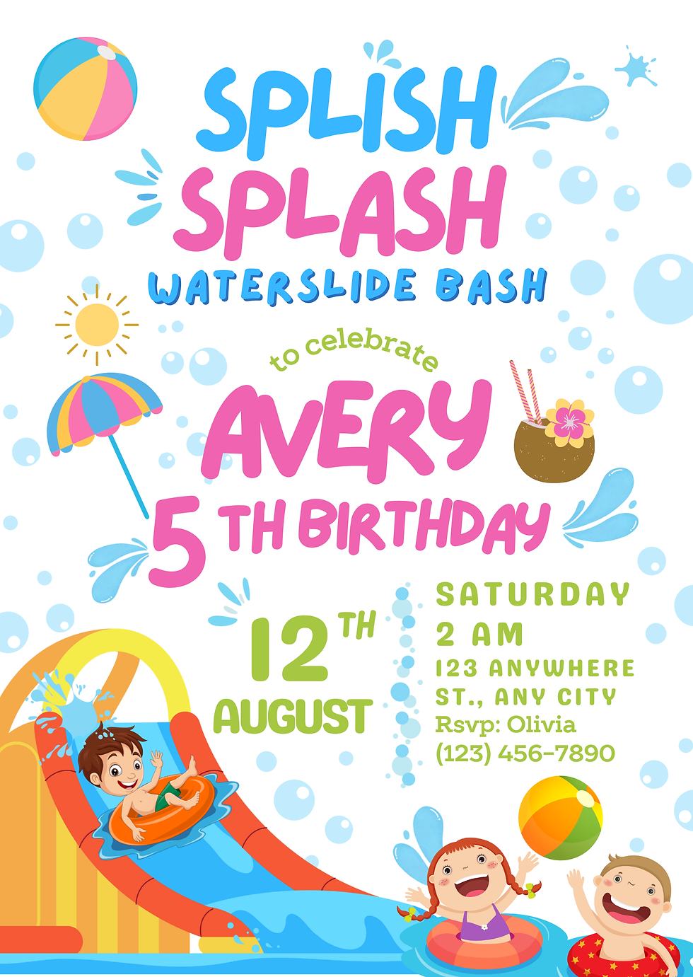 Blue And Pink Playful Illustrative Pool Party Invitation