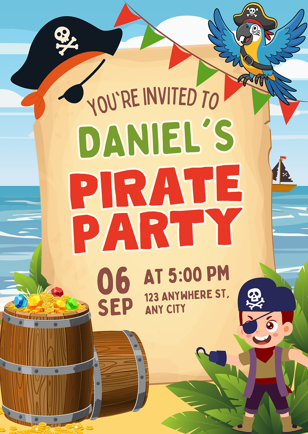 Bright Color Kids Cartoon Illustration Pirate Party Invitation