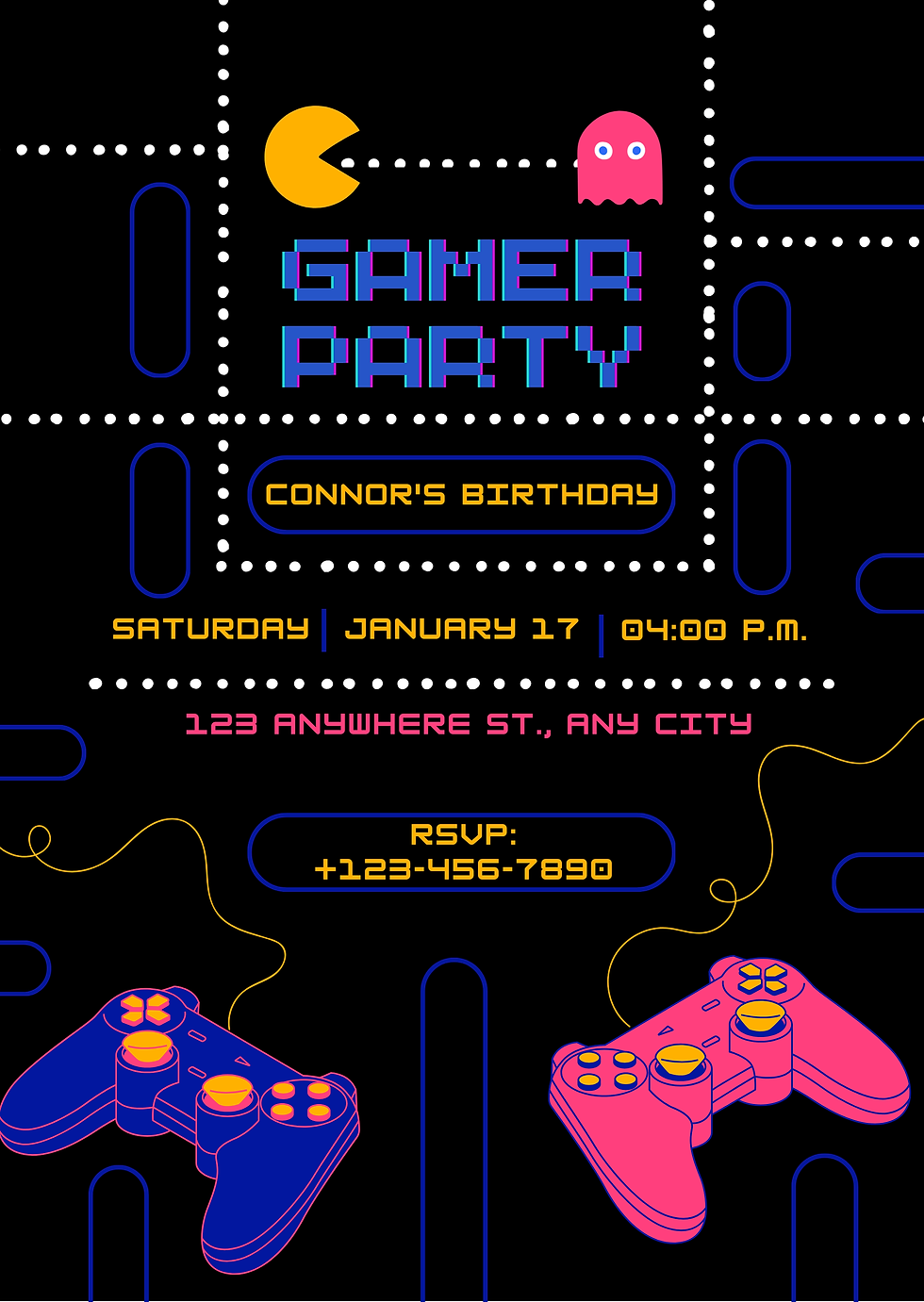 Blue and Pink Yellow Vintage Gamer Party Birthday Invitation.